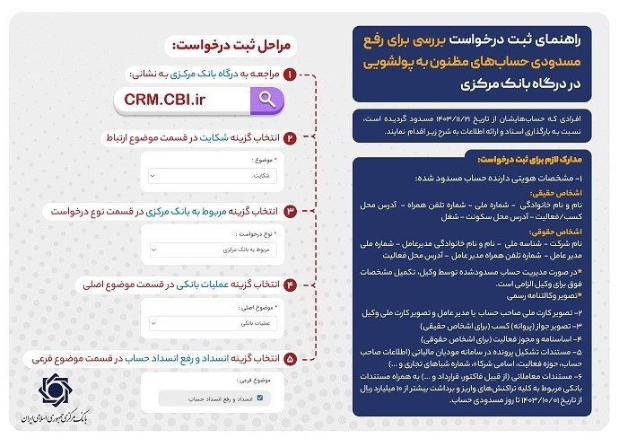 به گزارش خبرنگار بازار 361 به نقل از روابط عمومی بانک مرکزی، افرادی که حسابهایشان از تاریخ 21 بهمن ماه 1403 مسدود گردیده است، نسبت به بارگذاری اسناد و ارائه اطلاعات به شرح زیر اقدام و با انتخاب موضوع اصلی (عملیات بانکی)، موضوع فرعی( انسداد و رفع انسداد حساب) ثبت شکایت نمایند.